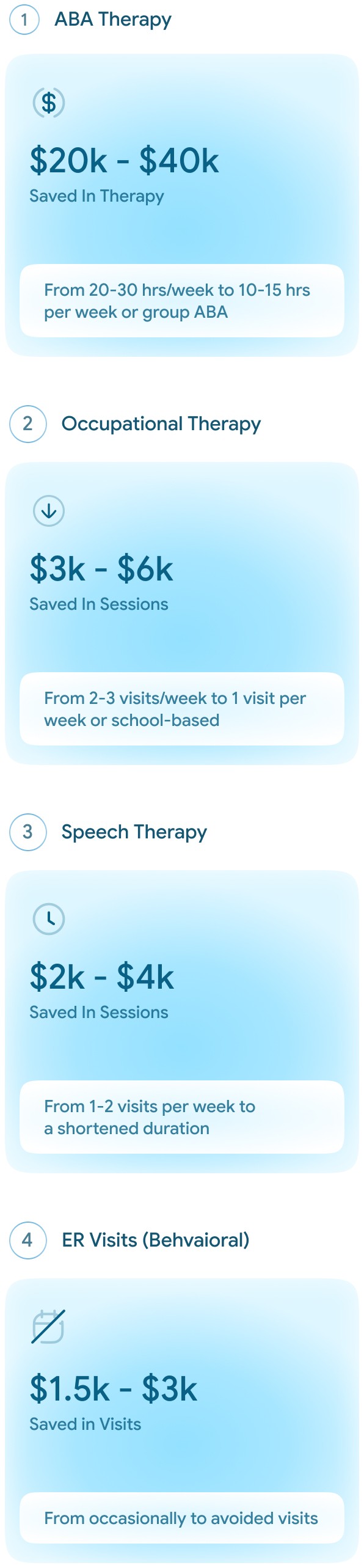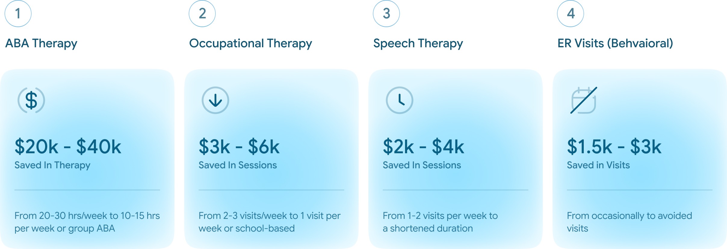 ROI Analysis for 1000 Users. For children receiving behavioral/therapeutic interventions, total annual expenditures (insurance + out of pocket) may range from $40k to $60k depending on intensity (www.nscl.org)